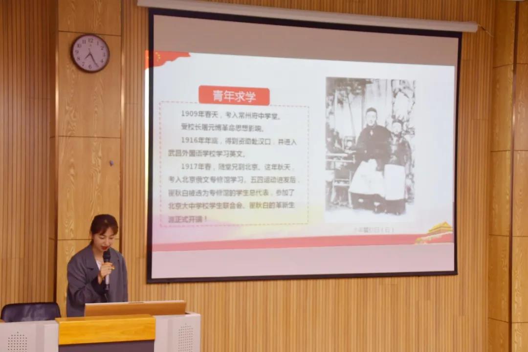 红色文化传播部的和银凤同志讲述了瞿秋白的先进事迹,毛泽东为《瞿秋白文集》题词,高度赞扬他在革命困难的年月里坚持了英雄的立场,宁愿向刽子手的屠刀走去,也不愿意屈服。