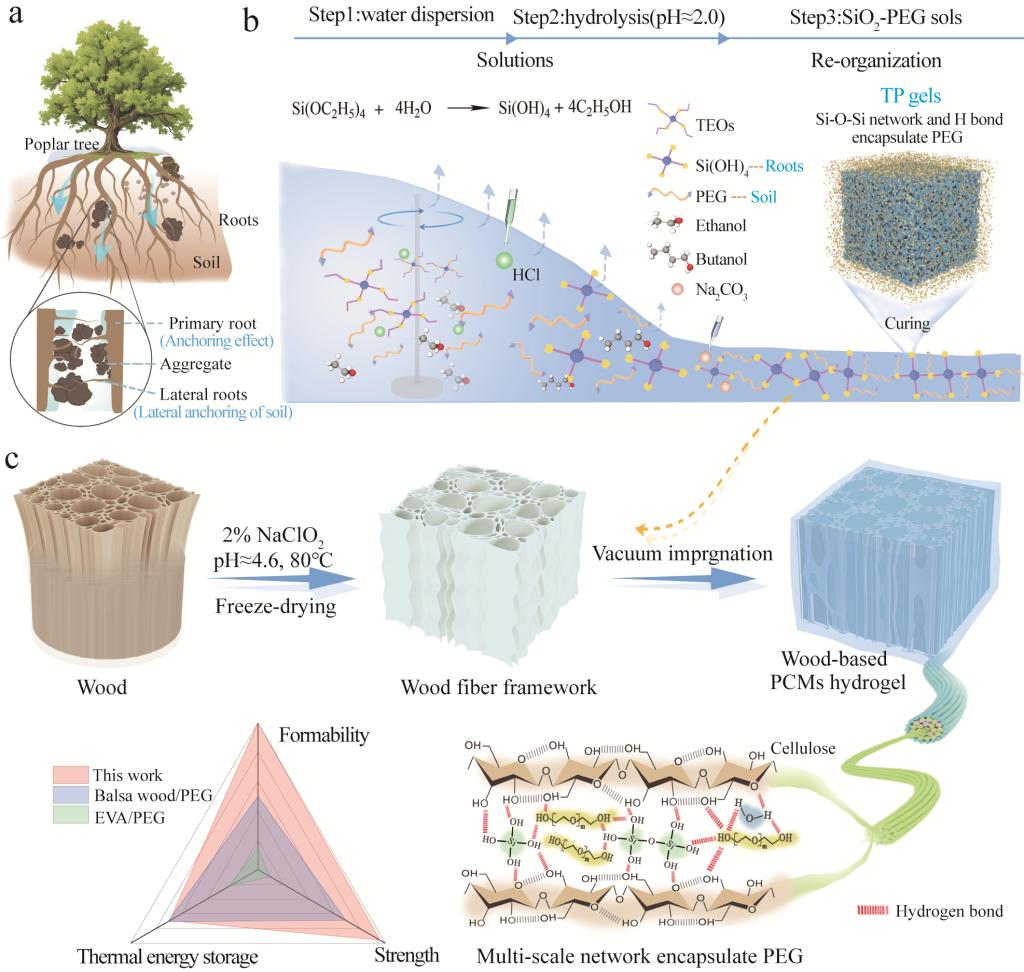 相变材料作为潜热储能技术的核心,通过可逆的相变过程实现热能的存储与释放,兼具能量储存与温度调控功能,是发展零能耗热管理系统的理想候选材料。目前,有机固-液相变材料(如聚乙二醇、石蜡、脂肪酸等)因具有相变焓值高、储能密度大、成本低廉及无毒等特点而备受关注。然而,其在相变过程中存在的液相泄漏、显著体积变化及机械强度低等问题,严重制约了实际应用。木材作为地球上储量最丰富的天然生物质材料之一,其内部具有分级连通的孔隙结构,形成天然丰富的网络结构,为物质传输提供了优化路径,因而被视为储能材料的理想载体。通常需通过高温热处理或脱木质素等预处理以提升其负载能力,但这类处理往往会显著削弱木材的机械性能。另外,环境温度超过相变点时,相变材料由固态转变为软弹态或液态,与刚性支撑体之间产生机械失配,可能导致相分离及性能持续衰减,在承重应用中尤其存在安全隐患。