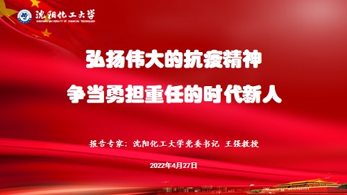 为深入学习贯彻习近平总书记关于疫情防控工作的重要讲话和指示批示精神,弘扬伟大抗疫精神,广泛宣传学校在抗疫斗争中涌现出的抗疫先进典型事迹和经验做法,发挥抗疫典型事迹的思想政治教育功能和思政课落实立德树人根本任务的关键作用,根据《省委教育工委 省教育厅关于组织全省高校开展伟大抗疫精神融入思想政治理论课教学活动的通知》要求,4月27日下午1时30分,校党委书记王强为化学工程学院、机械与动力工程学院、外国语学院2021级300余名本科生讲授专题思政课。马克思主义学院党总支书记周克刚主持课程。