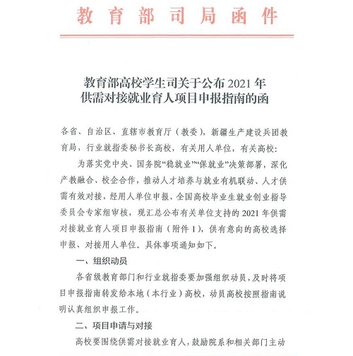 供需对接就业育人项目是教育部高校学生司为落实党中央、国务院“稳就业”“保就业”决策部署而开展的。根据《教育部高校学生司关于公布2021年供需对接就业育人项目申报指南的函》文件精神,招生与就业工作处认真贯彻落实,第一时间召开专题工作会议进行部署,广泛动员各二级院(部)和企业开展供需对接就业育人项目,先后有化学工程学院、材料科学与工程学院、能源与动力工程学院、经济管理学院、计算机科学与技术学院和人文与艺术学院进行了项目申报,经校企对接、用人单位申报、专家审核、立项单位信息核查等流程,最终获批13项,取得了丰硕的成果。