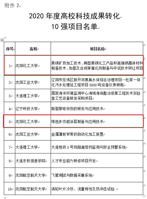为表彰先进,树立典型,引导和鼓励辽宁省高校在新的一年里取得更大成绩,推动辽宁省高校科技成果转化工作再上新台阶,并推动高等院校与地方经济相互促进、共同发展,近日,省教育厅发布《辽宁省教育厅关于公布2020年度高校科技成果转化10强高校和10强项目的通知》(辽教发〔2021〕17号)暨“2020辽宁省高校科技成果转化10强高校和10强项目”名单揭晓,taptap点点入选10强高校,并且由许光文校长主持的“菱镁矿热加工技术、典型菱镁化工产品和高端镁晶体材料制备技术、加氢及合成等催化剂制备与中试技术转让项目”和王娜教授主持的“绿色多功能涂层制备与应用技术”两项项目入选10强项目。