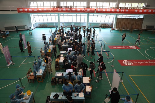 接种当日,师生们依次排队经体温检测进场。登记区的工作人员及志愿者对接种者进行身份核验、健康问询、禁忌筛查并签署知情同意书。接种区医务人员快速高效完成疫苗接种。完成接种后,接种者在留观区观察30分钟,无不适症状即可按指示离场。