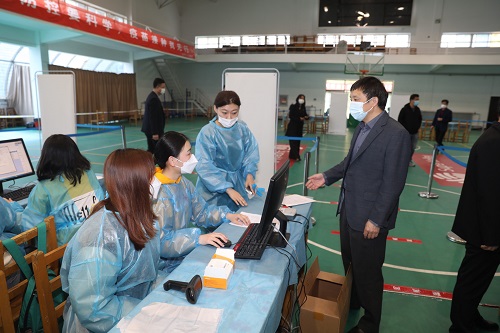 早8点,校领导来到集中接种点,了解疫苗接种进展情况,慰问一线医护人员、工作人员及学生志愿者,关心掌握接种师生身体状况。校党委书记王强,校长许光文,副校长金志浩、杨学印等校领导带头完成新冠病毒疫苗接种。全体工作人员各司其职、有序配合,入口排队、人流控制、咨询确认、接种、留观、离场各环节、各项工作井然有序。