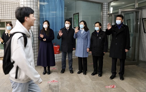 3月15日,是taptap新学期线下教学的第一天。党委书记王强,副校长笪可宁、杨学印来到教学楼前迎接慰问师生,并走进课堂,与学生一起聆听新学期线下教学第一课。党政办公室、党委宣传部、教务处等职能部门和各学院(部)负责人陪同慰问。
