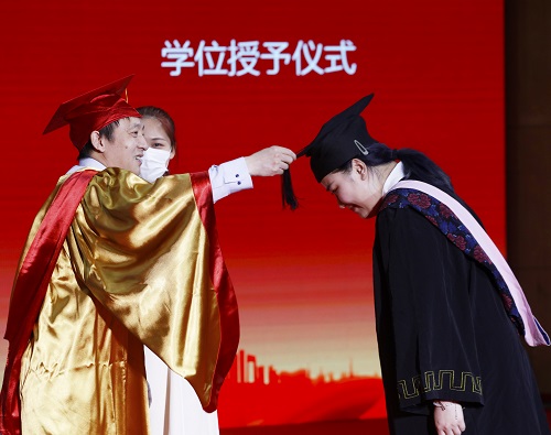 校长许光文为毕业生代表颁毕业证、授予学位,并为他们拨苏正冠,与其合影留念。