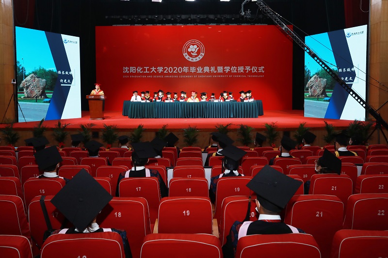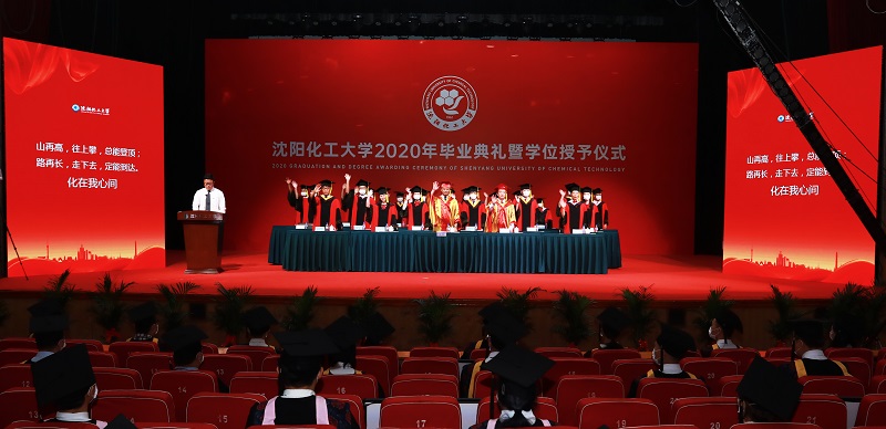 毕业典礼前,与会领导和师生共同观看了2020届毕业纪念片《入海》和《化大,我爱你》以及校领导和毕业生辅导员、教师精心录制的祝福视频。毕业生们共同回忆着自己在化大的求学收获与成长点滴,现场充满了感动与不舍。
