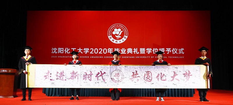 纪委书记孟宪梅代表学校接受毕业生献礼。毕业生们赠予母校一幅长八米的巨幅祝福语书卷,卷轴以“走进新时代、共圆化大梦”为主题,由2020届毕业生共同手写“化大,我爱你”,表达了莘莘学子对母校的感恩之情。