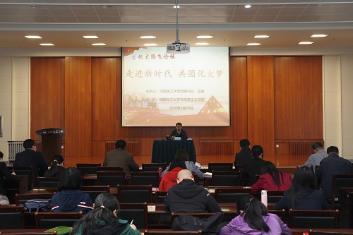 在讲坛上,王强书记作了《走进新时代、共圆化大梦》的专题报告。报告分为“时代之约”“疫情之变”“思政之问”“腾飞之梦”四个部分。一是要与时俱进,共赴“时代之约”。报告分析研判了国内国际形势,指出作为教育工作者,特别是思政课教师要与时俱进,紧跟时代步伐,并从马克思主义、中国特色社会主义、党的建设等三个方面阐述如何与时俱进,共赴“时代之约”。二是要思考“变”与“不变”,应对“疫情之变”。报告介绍了世界共同抗击疫情的情况,中国在疫情防控中彰显出的优势,中国人民经受住了疫情大考,化大战疫的经验和成果。面对大考之年、规划之年、治理之年,学校将努力打好内涵建设、深化改革、基础建设“三大攻坚战”,坚决做好“两手抓”,努力夺取“双胜利”。三是要回归本来,回答“思政之问”。报告阐述了教育的本质—爱的传递、心灵的呼喊;高校在人才培养、意识形态、社会思想文化、创新创业等方面的重要地位;思政工作在经济、政治、文化等各方面的突出作用和建强思政教师专兼职队伍的必要性。四是要共同努力,实现化大“腾飞之梦”。报告描绘了学校“十四五”“十五五”的发展蓝图。在未来的发展建设中,化大人要艰苦奋斗、全力以赴,跑出化大加速度,为实现化大腾飞梦共同努力。