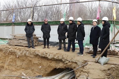 12月27日下午,党委书记王强、纪委书记孟宪梅、副校长杨学印在相关部门负责人陪同下到基础教学实验中心施工现场视察,了解工程建设情况。
