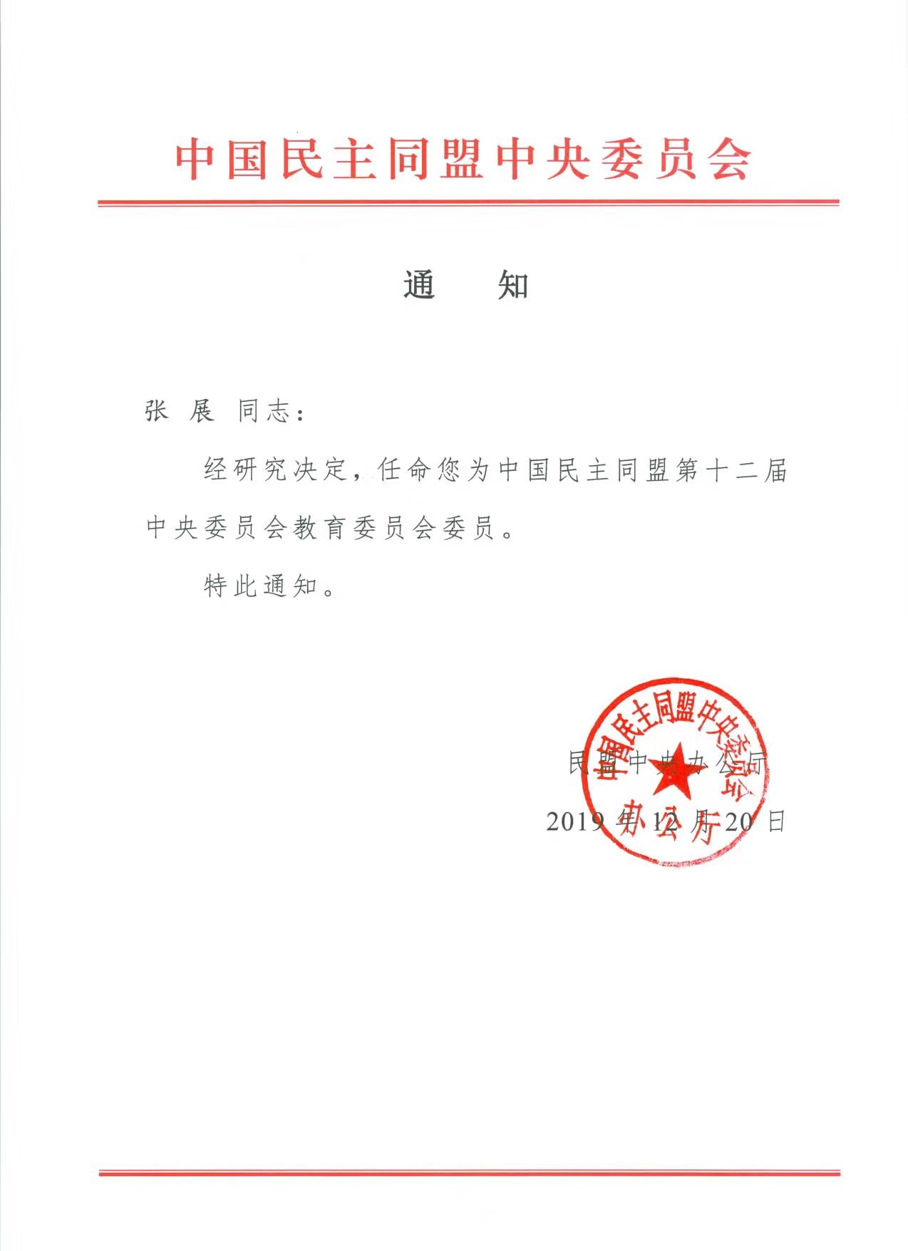 12月20日,经中国民主同盟第十二届中央委员会主席会议决定:任命taptap民盟副主委、经济与管理学院院长张展教授为民盟中央委员会教育委员会委员。