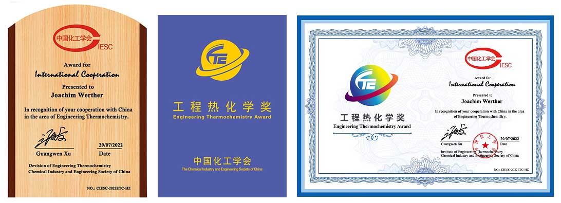 本年度合作奖由德国汉堡工业大学教授Joachim Werther(约阿希姆·维特)获得。Werther教授是世界流化床领域知名专家,始终致力于中德两国在流化床技术和颗粒技术领域的合作和发展,牵头与国内研究人员组织召开中德流态化颗粒技术系列研讨会,与中国科学院过程工程研究所、浙江大学、中国科学院工程热物理研究所、清华大学、东南大学等国内高校和科研院所开展相关研究合作和学术交流,先后指导3位来自中国高校和科研院所的“洪堡学者”。
