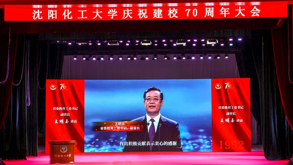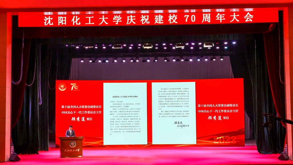 党委书记王强宣读了原全国人大常委会副委员长,原化工部部长,中国关心下一代工作委员会主任顾秀莲的贺信。顾秀莲在贺信中向全体老同志、教职员工、已经毕业和在校学生表示衷心的祝贺!她指出,七十年来,历届领导班子和师生员工努力奋斗、吃苦耐劳、科技兴化、教育强国,克服各种困难,披荆斩棘、自强不息、稳中求进、踔厉奋发,走内涵式、创新型、特色化、开放式的办学道路,把一所规模小、学生少、知名度不高的普通院校加速发展成具有万人规模、多学科、影响力逐步提升的新学校,踏上了“双一流”建设新征程,开启了学校高质量发展的崭新篇章。