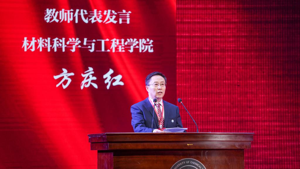 教师代表、材料科学与工程学院方庆红教授发言。他表示,一代又一代化大教师潜心静气教书育人,科技创新勇攀高峰,用辛勤耕耘和默默奉献擦亮了化大教师的鲜明底色,在70年建校历史上镌刻了最美的化大印记。他表示,将继续与全体化大教职员工,恪守为人师表、身正为范的准则,不断开拓创新,着力培养更多新时代合格建设者和接班人,为推动学校高质量发展、早日实现高水平教学研究型大学的建设目标交出无愧历史的满意答卷。