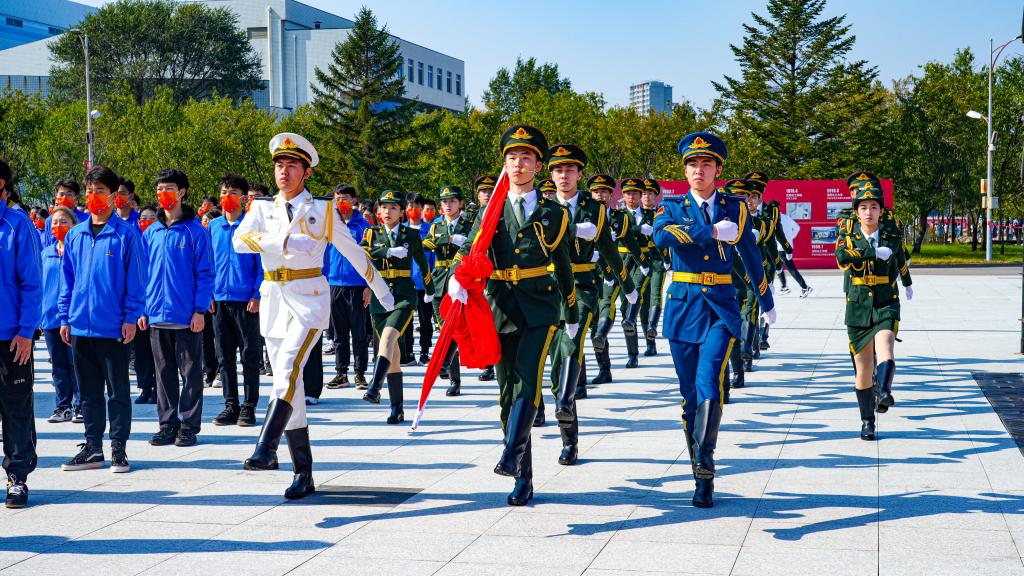 中午12时40分,升旗仪式正式开始。在庄严肃穆的氛围中,国旗护卫队迈着铿锵有力、整齐划一的步伐将国旗护送至升旗台。伴着激昂雄壮的国歌声,五星红旗冉冉升起,全体师生行注目礼,齐唱国歌。