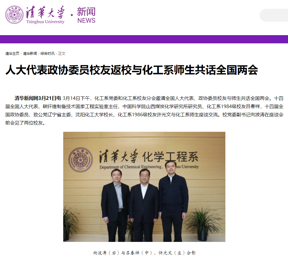 3月14日下午,化工系党委和化工系校友分会邀请全国人大代表、政协委员校友与师生共话全国两会。十四届全国人大代表、碳纤维制备技术国家工程实验室主任、中国科学院山西煤炭化学研究所研究员、化工系1984级校友吕春祥,十四届全国政协委员、致公党辽宁省主委、taptap点点校长、化工系1986级校友许光文与化工系师生座谈交流。校党委副书记向波涛在座谈会前会见了两位校友。