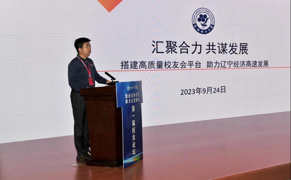 校党委书记王强致欢迎辞。他代表学校党委和全体师生向出席论坛的领导、嘉宾以及校友们表示热烈欢迎和衷心感谢。对于新时代校友工作的开展,他提出五点倡议:一是携手努力构建命运共同体,建设红色育人化大。共同弘扬以“化工报国”为核心的爱国精神和荣校情怀,共同培养更多赓续红色血脉、堪当民族复兴大任的时代新人。二是携手努力构建学术共同体,建设绿色学术化大。持续推动学术成果产出,有效促进科技成果转化,共同服务国家“双碳”战略和我省化工产业转型升级。三是携手努力构建思想共同体,建设橙色创新化大。优化学校办学体制机制,助力校友企业改革发展,共同引领社会风气之先。四是携手努力构建发展共同体,建设蓝色开放化大。在实现双方共享、共建、共赢的同时,主动融入和服务辽宁开放格局和国家“一带一路”发展大局。五是携手努力构建幸福共同体,建设金色奋进化大。广大校友要在各自战线上担当作为、奋勇争先,与母校在建设社会主义现代化强国、实现辽宁全面振兴的新征程上同舟共济、共铸荣光。