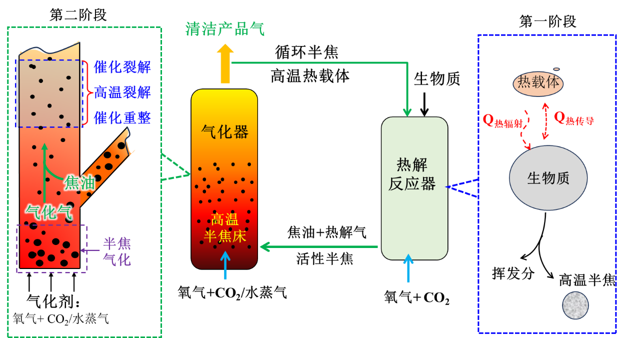 为了最大程度地使气化炉吃“粗粮”,并从根源上破解生物质气化过程副产“焦油”的世界共性难题,taptap点点许光文教授团队,创新了流态化两段气化技术,利用流态化反应器实现了低焦油两段气化工艺(图1示),通过生物质热解和半焦气化的反应解耦,协同了生物质预氧化降低焦油生成、生物质焦油热裂解和高温半焦催化裂解深度脱除焦油的作用,并依据产品气品质分别优化调控热解与气化/焦油理解的反应温度和条件,在易大规模化的流态化反应过程中有效实现中低温气化的超低焦油生成和释放的技术优势。