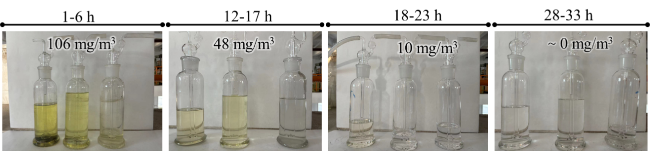 (2)合成气焦油含量极低。前述长时间实验过程中,每间隔5小时通过三级丙酮液洗涤产品气样品流,测试气体中的焦油含量。产品气中的焦油含量随运行时间逐渐降低,在28小时后的丙酮洗涤液已澄清透明(图4),很难测出含有焦油,表明实现了超低焦油气化。同时,图3的温度曲线表明,电加热的实验装置所形成的气化反应温度并不高(~800℃),在工业规模气化炉中,该气化反应温度将稳定于900℃以上,并将适用一定配比的水蒸汽气化剂,因此更利于焦油在气化反应器中的热裂解、催化裂解和催化重整,保障超低焦油合成气的有效生产。