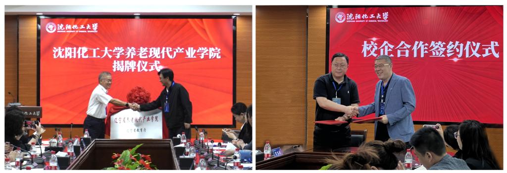 金志浩、赵海林共同为养老现代产业学院揭牌。人文与艺术学院党委周克刚书记和沈阳市大东区安和社会工作服务中心刘涛副理事长共同签订了校企合作协议。