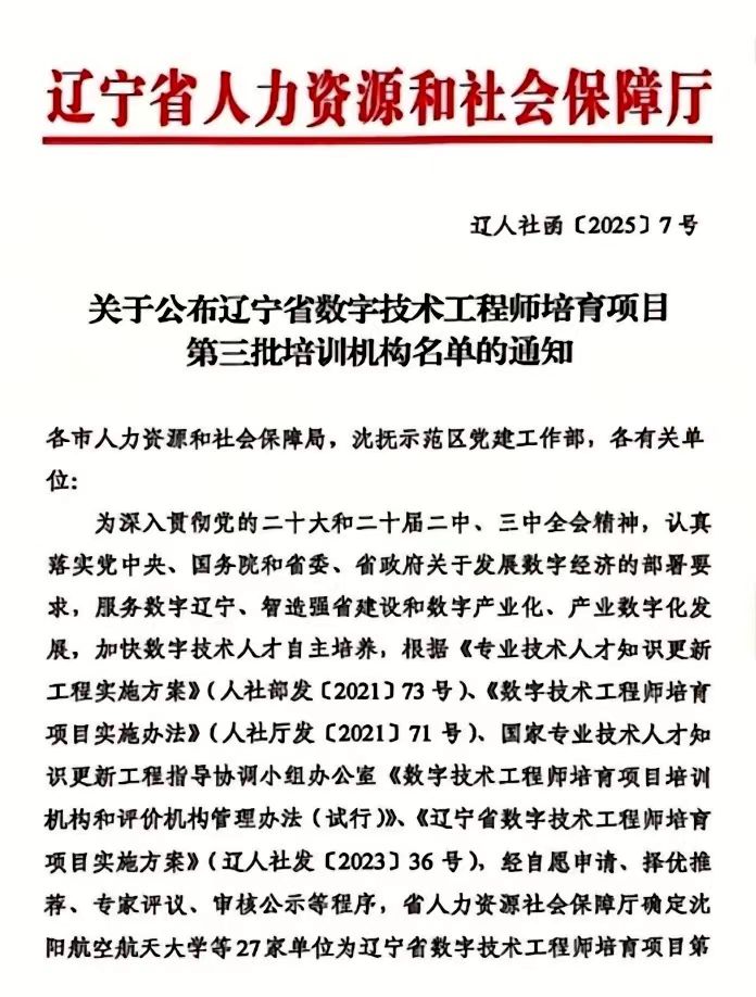 根据《专业技术人才知识更新工程实施方案》(人社部发[2021]73号)、《数字技术工程师培育项目实施办法》(人社厅发[2021]71号)、国家专业技术人才知识更新工程指导协调小组办公室《数字技术工程师培育项目培训机构和评价机构管理办法(试行)》、《辽宁省数字技术工程师培育项目实施方案》(辽人社发[2023]36号),经自愿申请、择优推荐、专家评议、审核公示等程序,taptap点点被省人力资源和社会保障厅确定为辽宁省数字技术工程师培育项目第三批培训机构,获得集成电路、人工智能、大数据工程技术人员三个项目的培训机构资质。