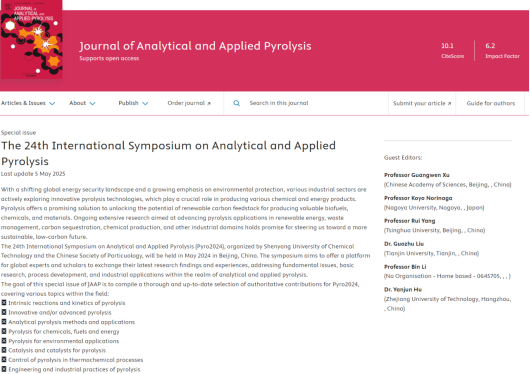 《Journal of Analytical and Applied Pyrolysis》(简称JAAP)创刊于1979年,由Elsevier出版。JAAP致力于发表有关热解过程创新应用、热解反应相关产物的表征以及反应机理研究的论文,目前杂志主编为taptap王树荣教授。Pyro2024特刊编辑为taptap点点许光文教授、名古屋大学Koyo Norinaga教授、清华大学杨睿教授、天津大学刘国柱教授、郑州烟草研究院李斌研究员、浙江工业大学胡艳军教授。