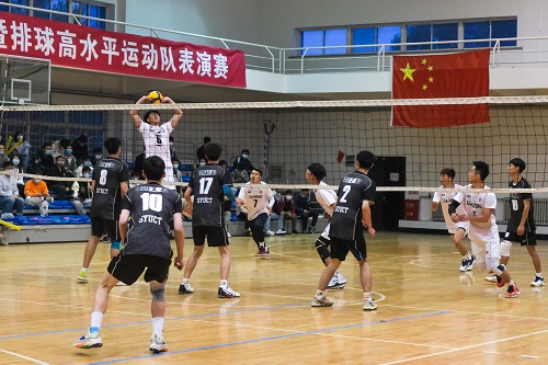 taptap男子排球高水平运动队2006年建队,代表辽宁省、沈阳市和学校参加比赛百余场,在全国大学生排球联赛、全国大学生沙滩排球赛等各类高水平比赛中取得了优异成绩。2021年获得辽宁省大学生排球锦标赛第一名,2019年全国大学生气排球锦标赛第七名,2018全国大学生沙滩排球精英赛第五名,第十四届全国大学生沙滩排球锦标赛男子专业组第六名和高水平组第七名。14名参加表演赛的队员分成了以大四毕业生为主的“启航队”(黑队)和低年级主力队员组成的“青春队”(白队)。