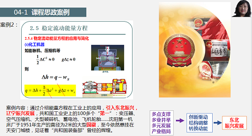 课上,毕老师结合课程、专业以及学科的实际,在挖掘课程所蕴含的思政元素的基础上对课程内容进行重新认识和重构再造,将所挖掘的思政元素有机融入课程教学,实现所讲授课程在思想政治教育和知识体系教育上的有机统一。她以“第二章-热力学基本定律”为例,分享教学中对有机融入思政元素的探索。授课过程中,她结合热机工作原理和热机效率问题,介绍热机发展历史,自然地引入共和国工业史100多个”第一”。通过案例引入“天安门城楼悬挂的大型国徽为沈阳第一机床厂于1951年生产的,它见证着‘共和国装备部’曾经的辉煌”,激发学生爱国热情和民族自豪感,坚定“四个自信”,厚植家国情怀。结合“第二类永动机的不可能性”,强化学生对《实践是检验真理的唯一标准》的理解,并由“第二类永动机的不可能性”,引导学生牢固树立绿色发展理念,走可持续发展之路,鼓励学生将个人价值和社会价值相结合,励精图治,将大有可为。