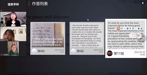 3月30日上午,校级课程思政示范课云端课堂正式开讲。外国语学院崔晗教授主讲的课程《英语口语表达与交流》是外国语学院近年来建设的系列拓展课之一,先后获评校级“混合式一流课程”、“课程思政示范课”,“辽宁省线上线下混合式一流课程”。在这堂精彩的口语课上,崔晗老师引入中国传统家庭观念中的善与孝、好朋友的标准等内容为学生的批判性讨论提供话题,并通过人际间交往引申到国与国之间的交往原则,将英文版《习近平谈治国理政》中的一章“做好周边外交工作”作为学习材料,与学生分享“亲、诚、惠、容”周边外交理念的英文表达,拓展学生完成口语任务相关的词汇短语与技巧,完成“输入”过程,为学生口语“输出”做好准备。