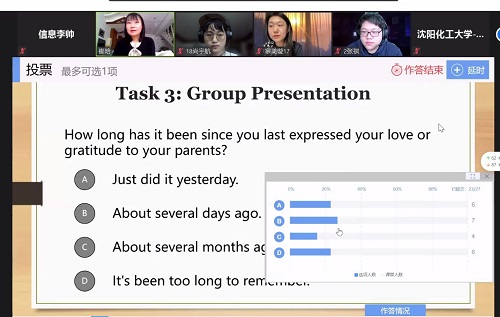 课堂上崔晗老师娴熟运用瞩目的分组讨论功能,雨课堂的投票、弹幕和小组任务等功能,采用“任务式”教学法和“小组合作”学习模式,培养学生自主探究能力、协作学习能力,激发了学生参与口语任务的热情和兴趣。课程最后,崔晗老师用社会主义核心价值观的英文表达做总结和拓展,引导学生对于真善美的追求和认同。同学们的口语表达内容中也都传达出了满满的正能量。