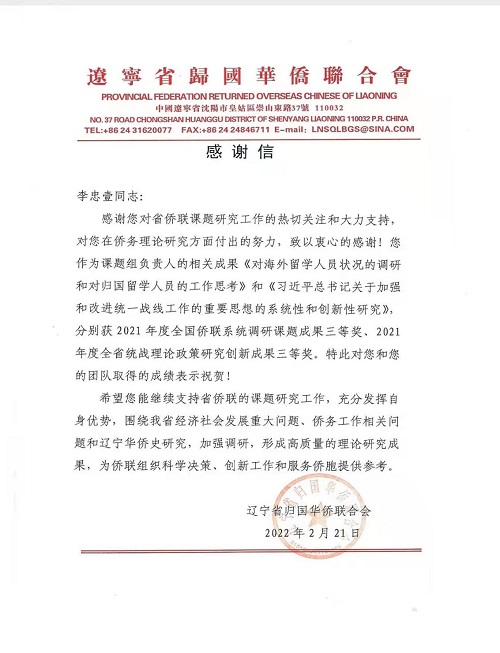 辽宁省侨联特致函课题组,对取得的成绩表示祝贺和感谢,希望继续支持辽宁省侨联课题研究工作,充分发挥自身优势,加强调查研究,形成高质量的理论研究成果,为侨联组织科学决策、创新工作和服务侨胞提供参考。