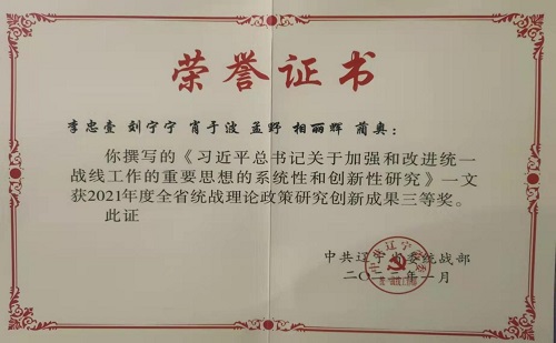 《对海外留学人员状况的调研和对归国留学人员的工作思考》调研报告,获2021年度全国侨联系统调研课题成果三等奖。此项调研课题共有29家省级侨联,以及中国侨联机关部门和单位报送课题成果125篇。经严格评审,并报中国侨联党组同意,对其中60篇予以中国侨联文件形式进行通报表扬。一等8篇,二等16篇,三等20篇,表扬16篇。《习近平总书记关于加强和改进统一战线工作的重要思想的系统性和创新性研究》获2021年度全省统战理论政策研究创新成果三等奖。
