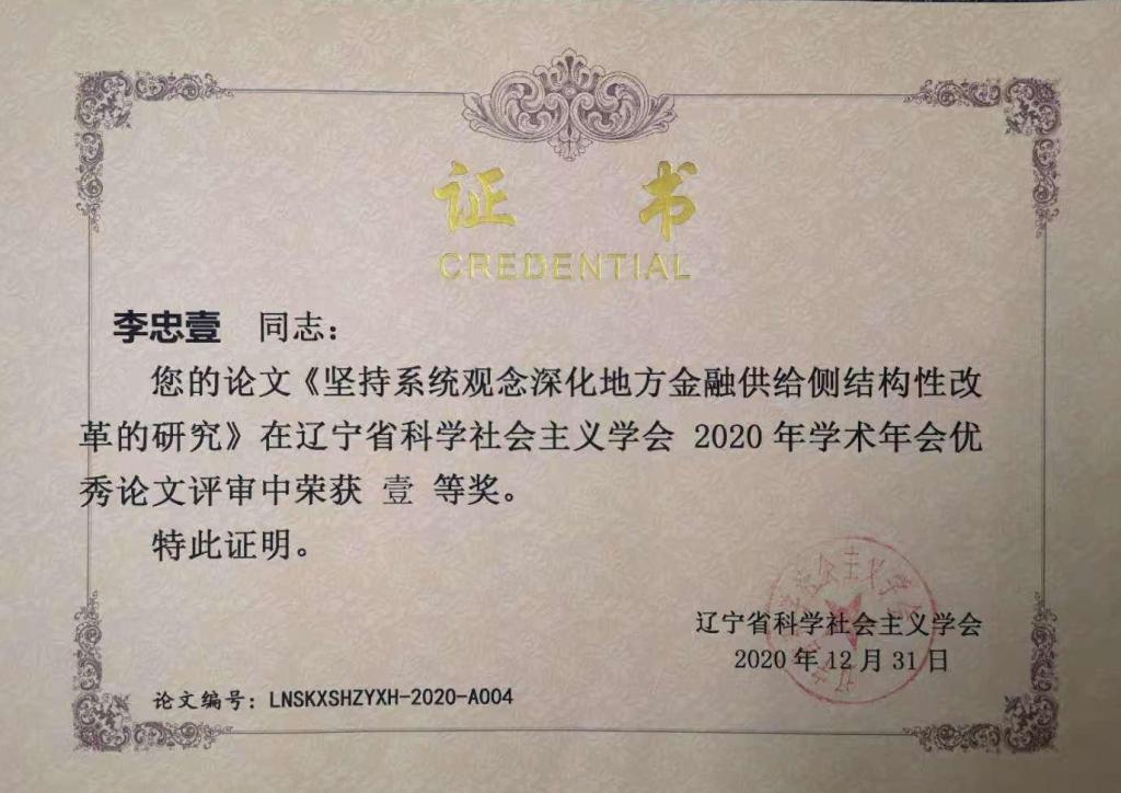 其课题成果《坚持系统观念深化地方金融供给侧结构性改革的研究》一文,获辽宁省科学社会主义学会2020年学术年会优秀论文壹等奖。