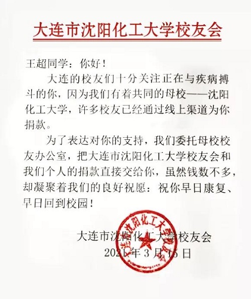 大连校友们得知相关情况后,纷纷通过轻松筹平台捐款。3月15日,大连校友会理事会主要成员商讨决定从大连校友会会费划拨3000元,何明洲、刘喜才、冯文远、卜鹏宇等四位校友捐款现金7000元,合计10000元,表达大连校友会对王超同学的慰问和关爱。大连校友会表示将会持续关注王超同学的康复情况,广大在连校友将与王超同学一起面对困难,帮助王超同学早日康复!