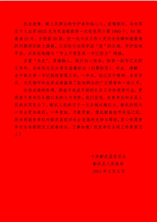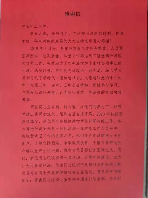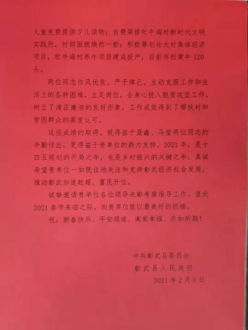 辛丑之春,佳节将至。正逢辞旧迎新的美好时刻,彰武县委、县政府向taptap发来感谢信,对taptap马林、聂鑫、马莹三位扶贫干部的扎实工作、辛苦付出和对taptap长期的鼎力支持表示感谢!向taptap全体干部职工致以衷心的新年祝福。