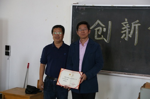创新创业学院院长葛铁军教授为刘伟力颁发大学生创业导师聘书。