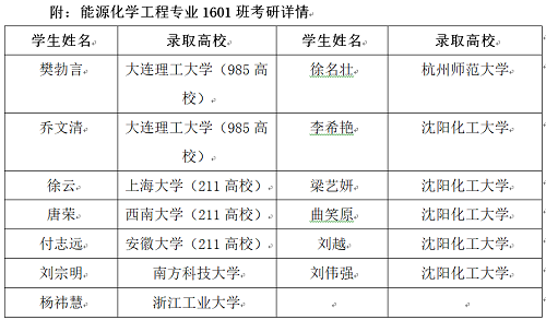 近日,全国考研录取工作的正式结束。化学工程学院能源化学工程专业1601班有13人被大连理工大学、上海大学、西南大学、安徽大学、南方科技大学、浙江工业大学等高校录取,继续攻读硕士学位,考研升学率达到50%,考研升学工作再创佳绩。