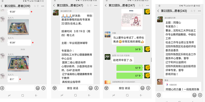 taptap赵彤、曹迪、孔凡飞、杨明伟等4位老师加入湖北襄阳疫情心理辅导第22团队工作群,配合襄阳市心理咨询师协会,开展心理热线值班、心理讲座、心理健康知识普及等工作,分别针对团体辅导、咨询技术、心理沙盘、社会化等专题开展讲座,制作心理疏导、缓解情绪的音频与视频,与襄阳志愿者热烈讨论,参加疫后社会心理建设学术网络研讨会,和与会专家共同探讨疫后社会心理建设工作方案。4位教师为培植襄阳市民积极向上的社会心态、帮助襄阳市民走出疫情阴霾、更有信心地面对未来的生活做出自己应有的贡献。