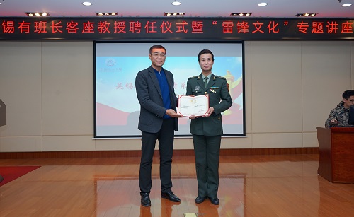 聘任仪式结束后,吴锡有班长以《携手新时代共筑中国梦》为题,从介绍雷锋生平、雷锋班的命名与发展以及当代大学生如何践行雷锋精神等方面作了雷锋文化和雷锋精神专题报告。他以富有感染力的讲述、深入浅出的讲解、鲜活生动的案例诠释了新时代雷锋精神的真谛。他表示,学习雷锋精神,是时代的呼唤。作为“雷锋精神”的坚定传承者和传播者,他号召大家大力弘扬雷锋精神,认真践行社会主义核心价值观,争当雷锋精神的弘扬者、倡导者和先行者,为实现中国梦而不懈奋斗。