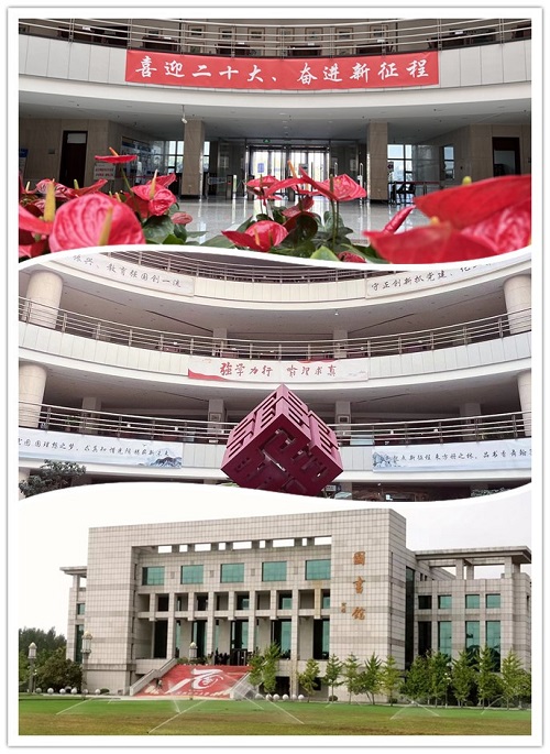同时,在全校上下喜迎校庆之际,图书馆发挥场地空间、文化环境优势,馆内,设计制作多幅书香氛围油画布,装饰于中庭三至五层环廊,营造出积极向上、清新高雅的校园文化氛围。馆外,在门前台阶外立面制作巨幅校庆标识,致敬70周年校庆。