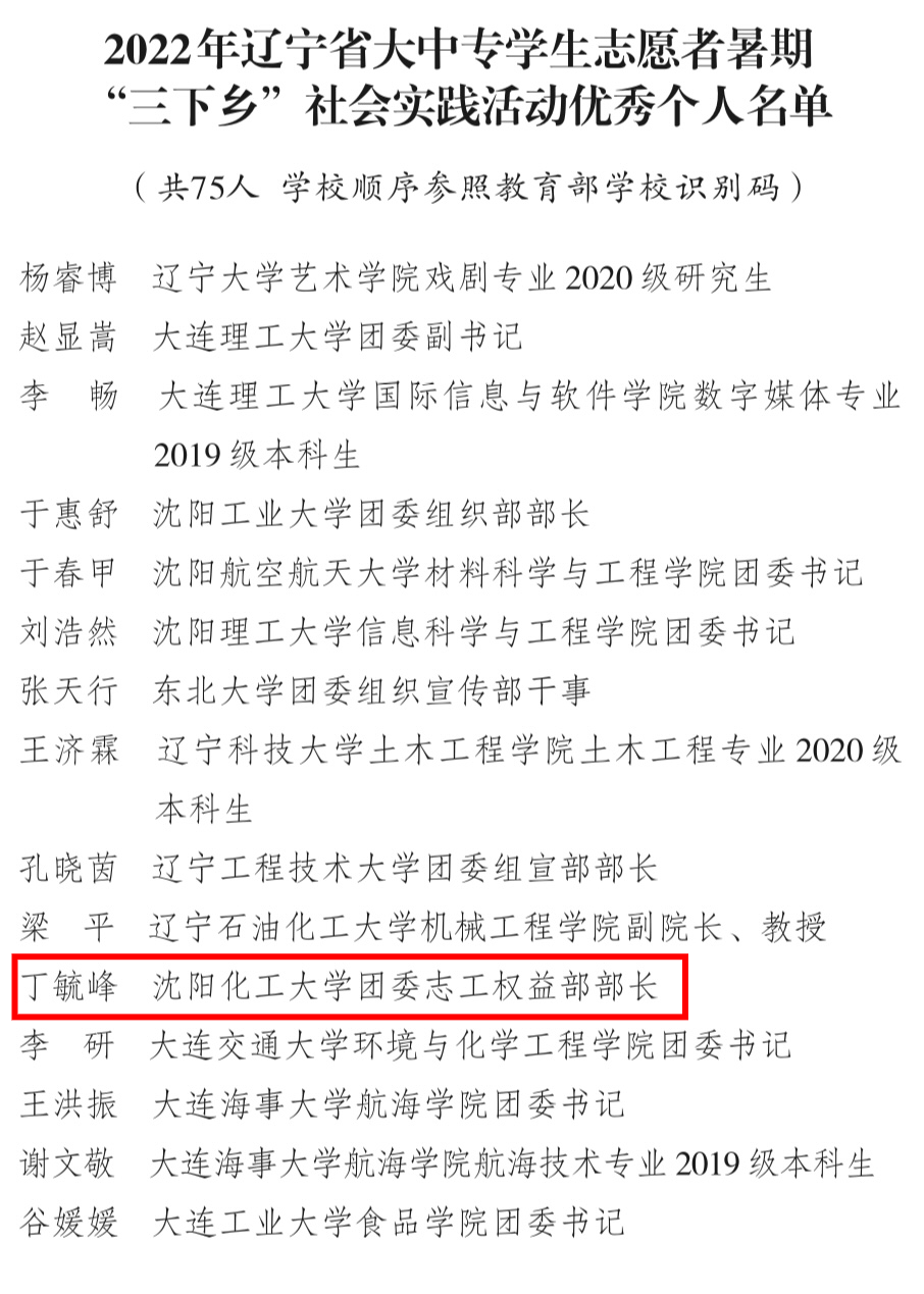 在团省委组织的评选中,taptap团委荣获2022年辽宁省大中专学生志愿者暑期“三下乡”社会实践活动优秀组织单位,机械与动力工程学院“聚力青春同筑梦 民族团结共践行”社会实践团、校团委“丈量红色之路,学习百年党史”社会实践团荣获优秀团队,校团委志工权益部部长丁毓峰荣获优秀个人荣誉称号。