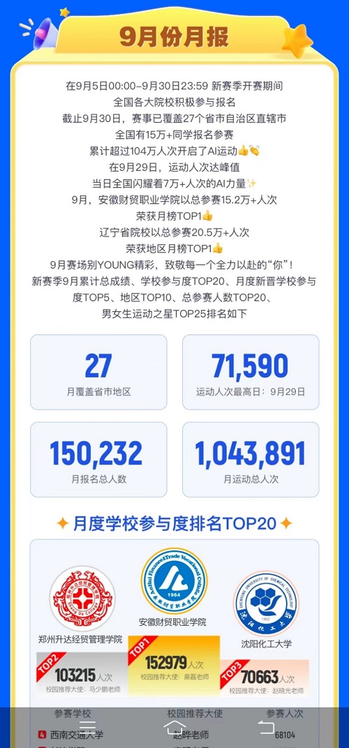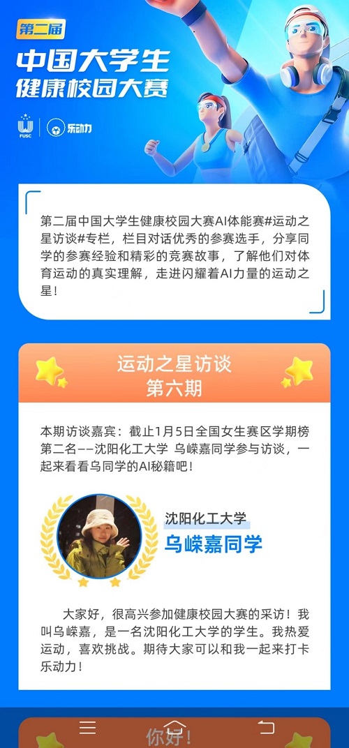 第二届中国大学生健康校园大赛暨AI体能赛上半赛季于2023年1月8日收官。taptap经济与管理学院2021级学生乌嵘嘉同学获得全国女生赛区学期榜第二名的优异成绩。在17周的赛制中乌嵘嘉同学分别在9月第二周、第三周和10月的第九周比赛中获得全国女生赛区的周冠军。三次登上光荣榜,获 “运动之星”称号,多次为学校争光。赛事组委会采访并报道了乌嵘嘉同学的先进事迹。