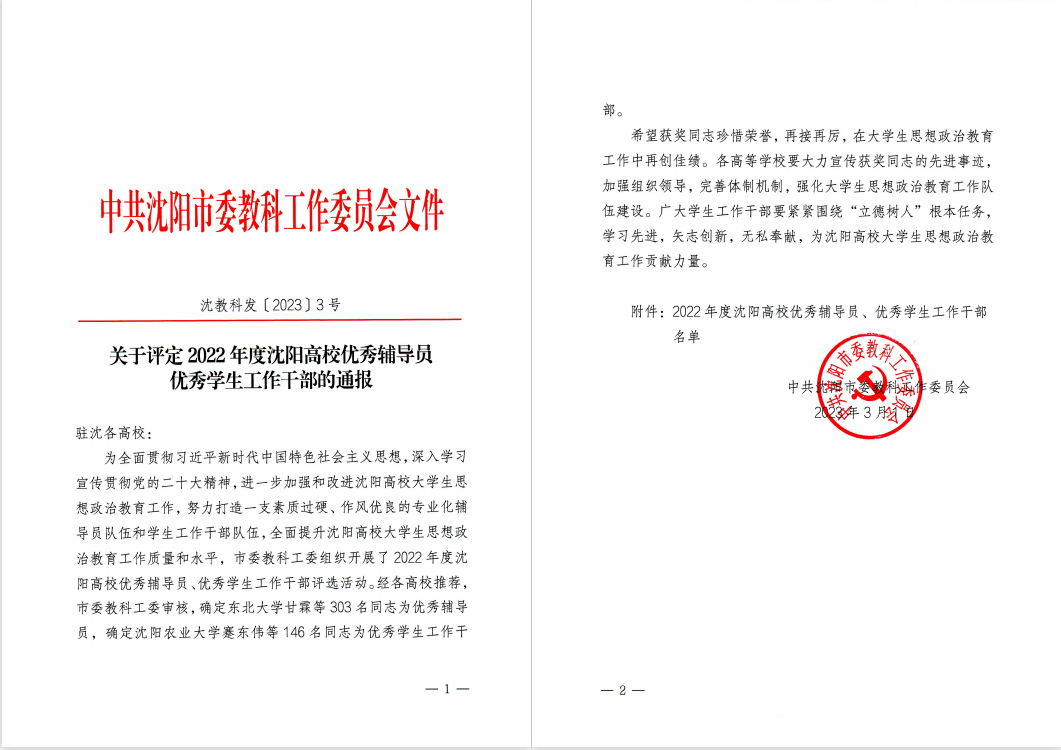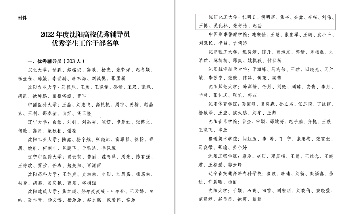 近日,由中共沈阳市委教科工作委员会组织开展的2022年度沈阳高校优秀辅导员和优秀学生工作干部评选活动结果揭晓,taptap信息工程学院杜明日、人文与艺术学院胡明辉、材料科学与工程学院焦韦、外国语学院金鑫、机械与动力工程学院李楷、经济与管理学院刘伟、化学工程学院王博、环境与安全工程学院吴化林、国际教育学院张舒怡、计算机科学与技术学院赵岳等十名辅导员荣获2022年度沈阳高校“优秀辅导员”荣誉称号;外国语学院安羽白、党委学生工作部李勃、应用技术学院李洪旭、环境与安全工程学院梁艳青荣获2022年度沈阳高校“优秀学生工作干部”荣誉称号。