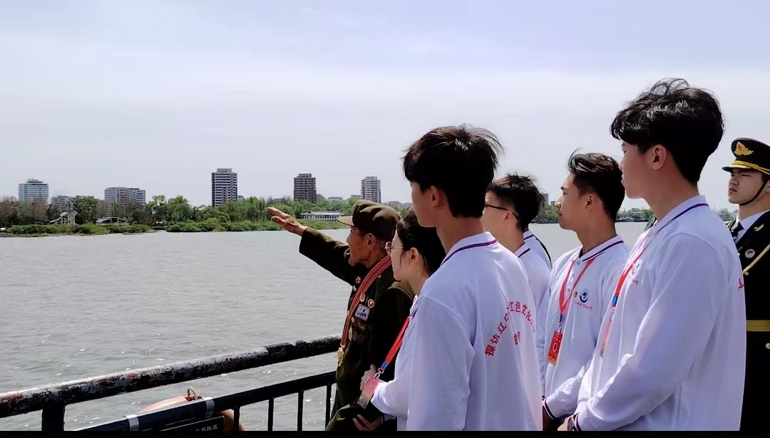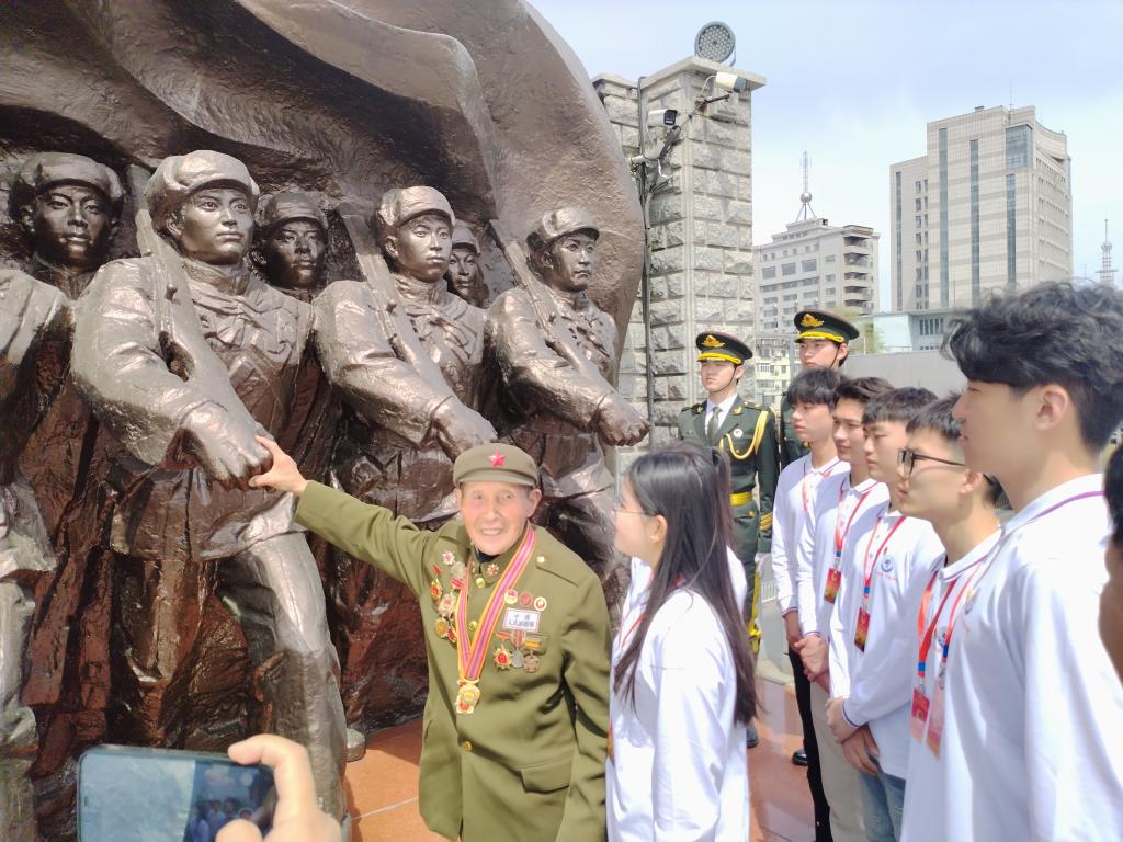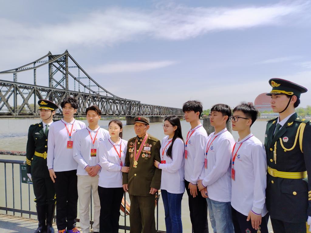 92岁的抗美援朝老兵孙德山与实践团成员一起走上鸭绿江大桥。老人家用自己最真挚的语言为实践团成员讲述着那段难忘岁月,在志愿军雕像面前,孙老说:“战友们,我带着大学生来看你们了,祖国没有忘记我们。”在断桥前,老人家遥望鸭绿江对岸,为大家讲述当年那战火纷飞的往事,并寄语化大青年,希望大家好好学习,肩负起建设祖国的重担。