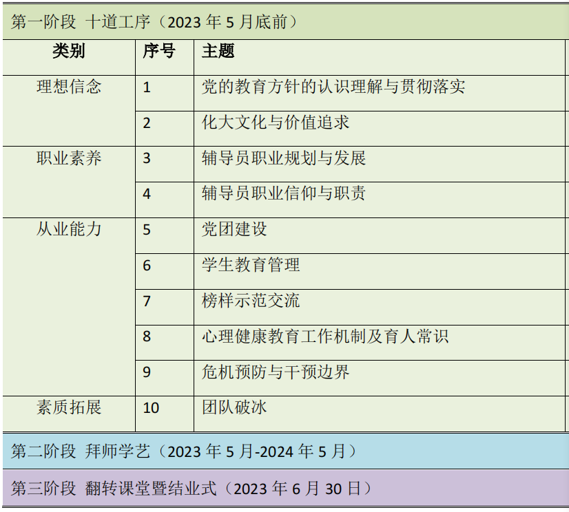 近年来,随着taptap辅导员专业化、专家化建设水平不断提升,新辅导员入职培训体系逐步系统化、科学化,形成了“十道工序”“拜师学艺”及“翻转课堂”三阶段体系。