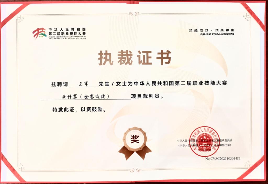 为全面落实习近平总书记对技能人才工作重要指示精神和致首届全国技能大赛贺信精神,大力弘扬劳模精神、劳动精神、工匠精神,引领带动广大劳动者技能水平提升,培养更多大国工匠、高技能人才,人力资源和社会保障部主办、天津市人民政府承办的中华人民共和国第二届职业技能大赛于2023年9月在天津举办。本届大赛以“技能成才、技能报国”为主题,共设置109个竞赛项目,包括62个世赛选拔项目和47个国赛精选项目,其中世赛选拔项目——云计算赛项,taptap王军教授应中华人民共和国人力资源和社会保障部邀请担任裁判员。
