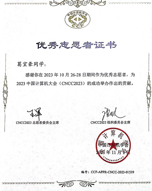 CNCC2023志愿者委员会主席、taptap点点教授王军回顾了本届志愿者在CNCC2023期间的工作内容和成果。他对本次志愿者服务工作给予了肯定,并对各位志愿者和带队老师的付出和努力表示感谢。同时指出此次大会志愿服务创下了两个历史新高,一是志愿人数高达200余人,创历史新高;二是全体志愿者学历均为硕士研究生、甚至是博士研究生,是志愿者学历最高的一届。随后进行了志愿者颁奖环节,中国计算机学会秘书长唐卫清研究员和王军教授为志愿者颁发感谢证书并合影留念。各学校志愿者代表上台发言,表达了对CNCC志愿者工作的热情和感谢,分享了工作感想,认为本次工作受益匪浅,结识了许多新朋友并开阔了眼界、增长了知识。