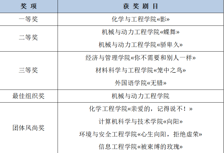 本次活动共收到来自11个学院的22份作品,经过初赛剧本选拔、复赛的现场演绎,共有6支队伍脱颖而出晋级决赛。经过参赛选手精心打磨和数次排练的作品使得决赛现场精彩纷呈,掌声雷动。材料科学与工程学院的«笼中之鸟»告诉我们平等待人,用心爱人,是人与人之间连接的重要法则;经济管理学院的«你不需要和别人一样»展现了每个人独特的魅力;机械与动力工程学院的«蝶舞»展现了原生家庭的伤痛与自我救赎;外国语学院的«无错»展现了初入大学的应该如何与同学们相处;化学与工程学院的«影»展现了沟通的重要性;机械与动力工程学院的«骄卑久»展现了寝室同学间的冲突与磨合。参赛选手的用心演绎使得现场观众纷纷入戏,引起了大家的共鸣,也让大家懂得了在遇到心理困扰时应及时自我觉察并向心理委员、辅导员、心理老师等专业人员求助。