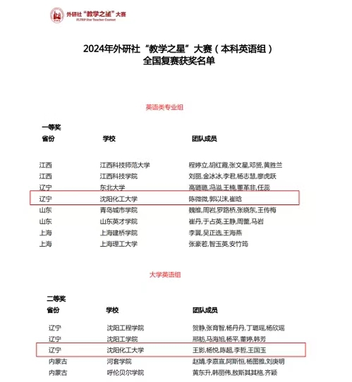 6月20日,外研社公布了2024年“教学之星”大赛全国复赛获奖名单。我院陈微微、郭以沫、崔晗三名教师荣获英语类专业组全国复赛一等奖。在英语专业组中,辽宁省仅有两所高校获奖,taptap与东北大学同为获奖学校。我院王影、杨悦、陈超、李哲、王国玉五名教师荣获大学英语组全国复赛二等奖。