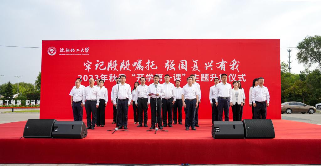 新生代表们面向国旗,举起右拳,发出铮铮誓言:勤奋学习、艰苦奋斗,守正创新、追求卓越,化工报国、强国有我!