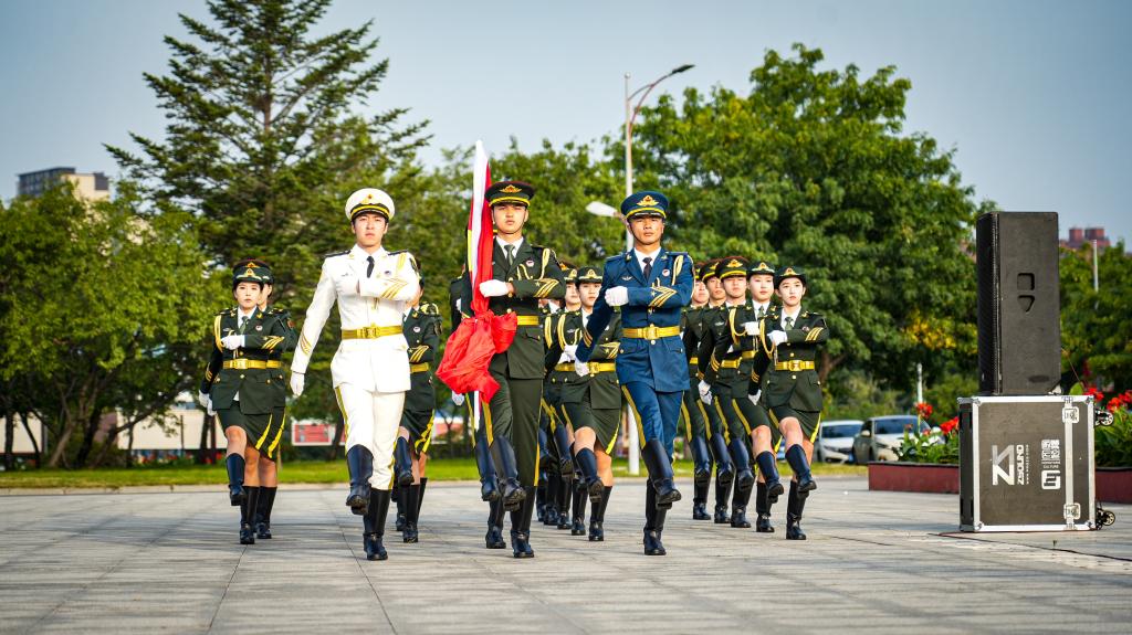 早上7点整,升旗仪式正式开始。在庄严肃穆的氛围中,国旗护卫队迈着铿锵有力、整齐划一的步伐将国旗护送至升旗台。伴着激昂雄壮的国歌声,五星红旗冉冉升起,全体师生行注目礼,齐唱国歌。
